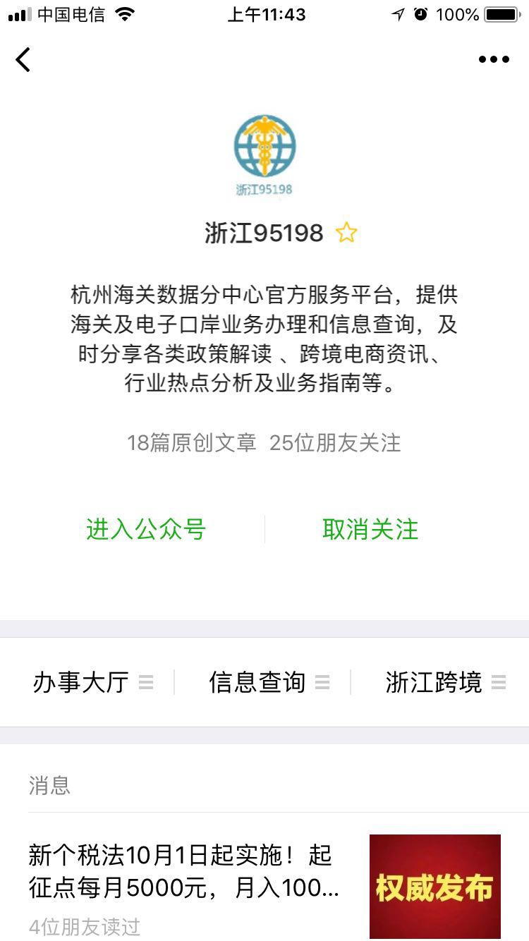 “浙江95198”是杭州海关数据分中心官方服务平台,提供海关及电子口岸业务办理和信息查询,及时分享各类政策解读、跨境电商资讯、行业热点分析及业务指南等。目前,粉丝已遍布35个省339个城市涵盖港澳地区,拥有IC卡预约、邮件申报、客服专区、在线课堂、信息查询等10个功能模块。其中,邮件申报功能模块成为“杭州海关个人进境邮递物品通关管理系统”唯一集查询与申报双向功能的移动端入口。